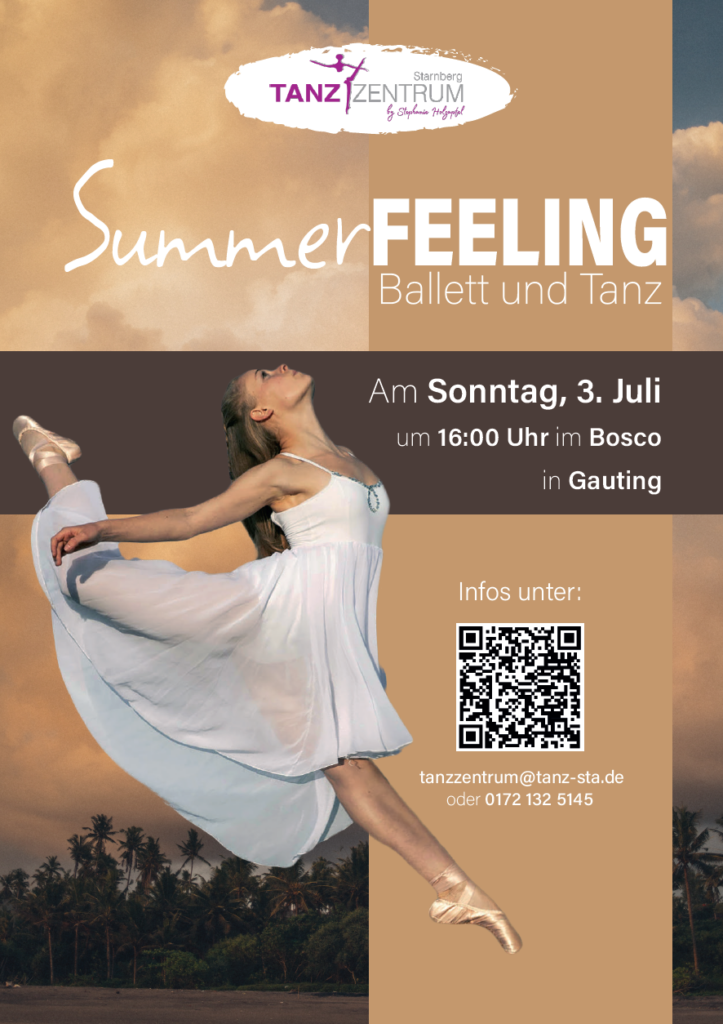 „Summerfeeling“- Ballett- und Tanzaufführung vom Tanzzentrum Starnberg am Sonntag, 3. Juli 2022 um 16.00 Uhr im Kulturhaus Bosco in Gauting. Die Karten können über das Kontaktformular und der E-Mail-Adresse: ticket@tanz-sta.de, Stichwort: Summerfeeling und über die Paypal Adresse: paypal@tanz-sta.de gekauft werden. 20,00 Euro/ ermäßigt 16,00 Euro (Kinder bis 14 Jahre) Kontaktformular